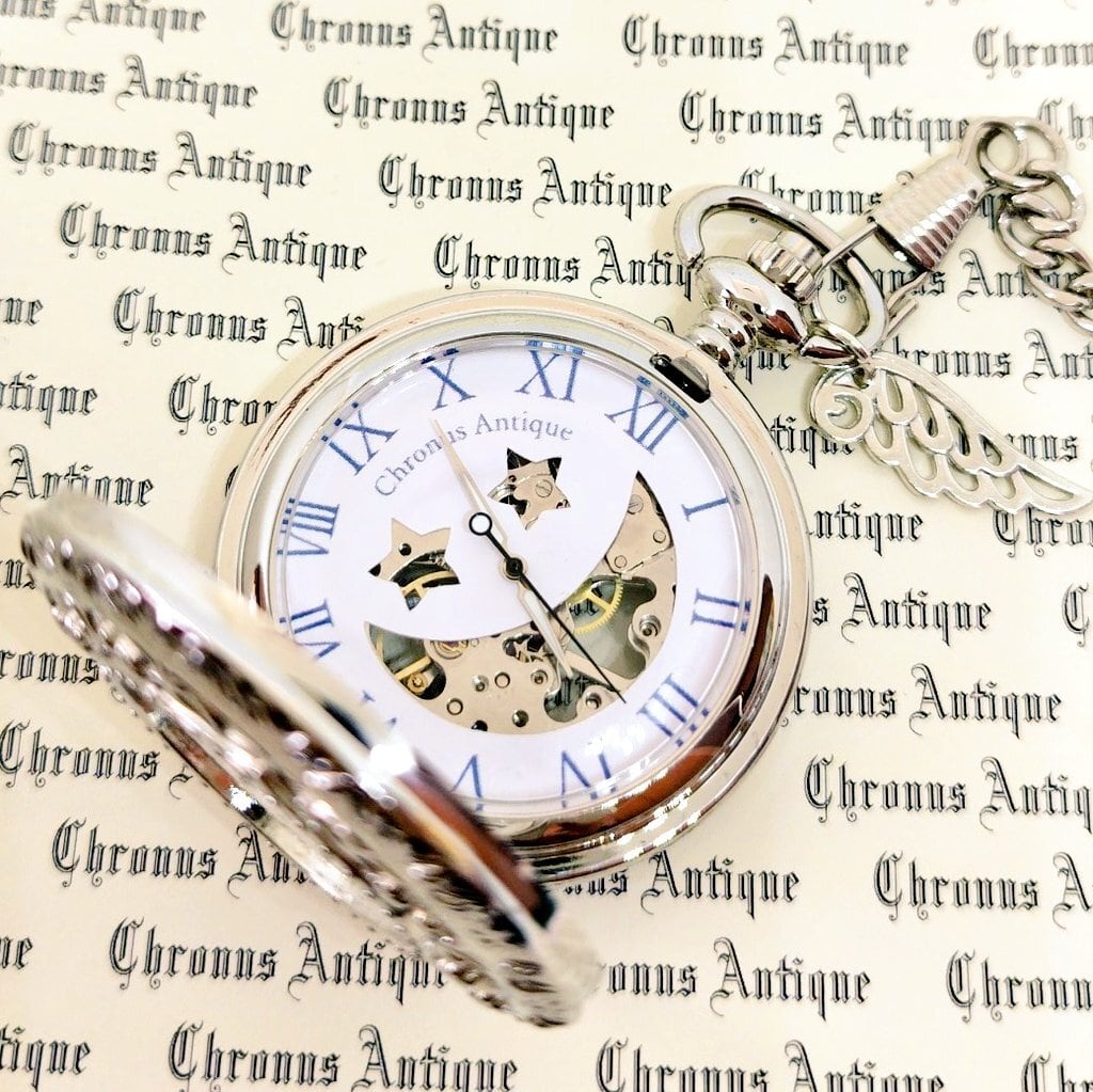 月と星をデザインしたシルバー色の機械式(手巻き式)懐中時計です。