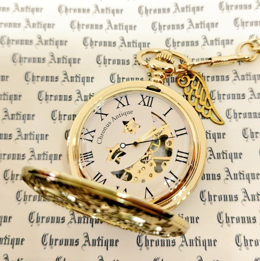 蓋部分には唐草模様と花がデザインされ、文字盤の月や星の透かしからは中のムーブメントが見えます。